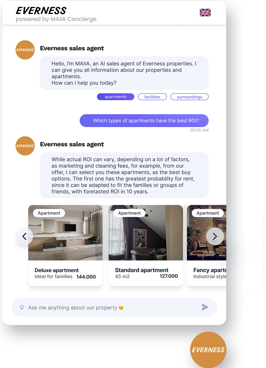 MAIIA Concierge donosi svakom graditelju apartmana i stanova priliku da ima zaposlenog prodajnog agenta na sajtu, koji govori nekoliko svetskih jezika i poseduje znanja vrhunskog agenta prodaje, koji može dati savete kao što su: