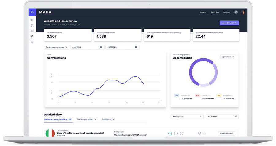 PREDSTAVITE SVOJE NEKRETNINE NA PRAVI NAČIN MAIIA može naučiti sve o vašim nekretninama i ponudi. Vi birate koje informacije će MAIIA prodajni agent imati, omogućavajući joj da odgovara na pitanja posetilaca. Kroz Centralnu aplikaciju, zadržavate kontrolu nad njenim znanjem i sami odlučujete o ponudama. UPOZNAJTE PREFERENCE VAŠIH POSETILACA MAIIA koristi algoritme za analizu sentimenta i preferenci kako bi razumela potrebe posetilaca, analizirala konverzacije i pratila trendove. Dashboard omogućava uvid u najpopularnije jedinice, kao i u same konverzacije. PREVODI NA JEDNOM MESTU MAIIA govori sve jezike, bez obzira da li su ponuđeni u padajućoj listi, te je vaši posetioci mogu pitati sve na sopstvenom jeziku. Sve konverzacije se automatski prevode na odabrani jezik vaše Centralne aplikacije, sa opcijom pristupanja originalnom jeziku konverzacije.